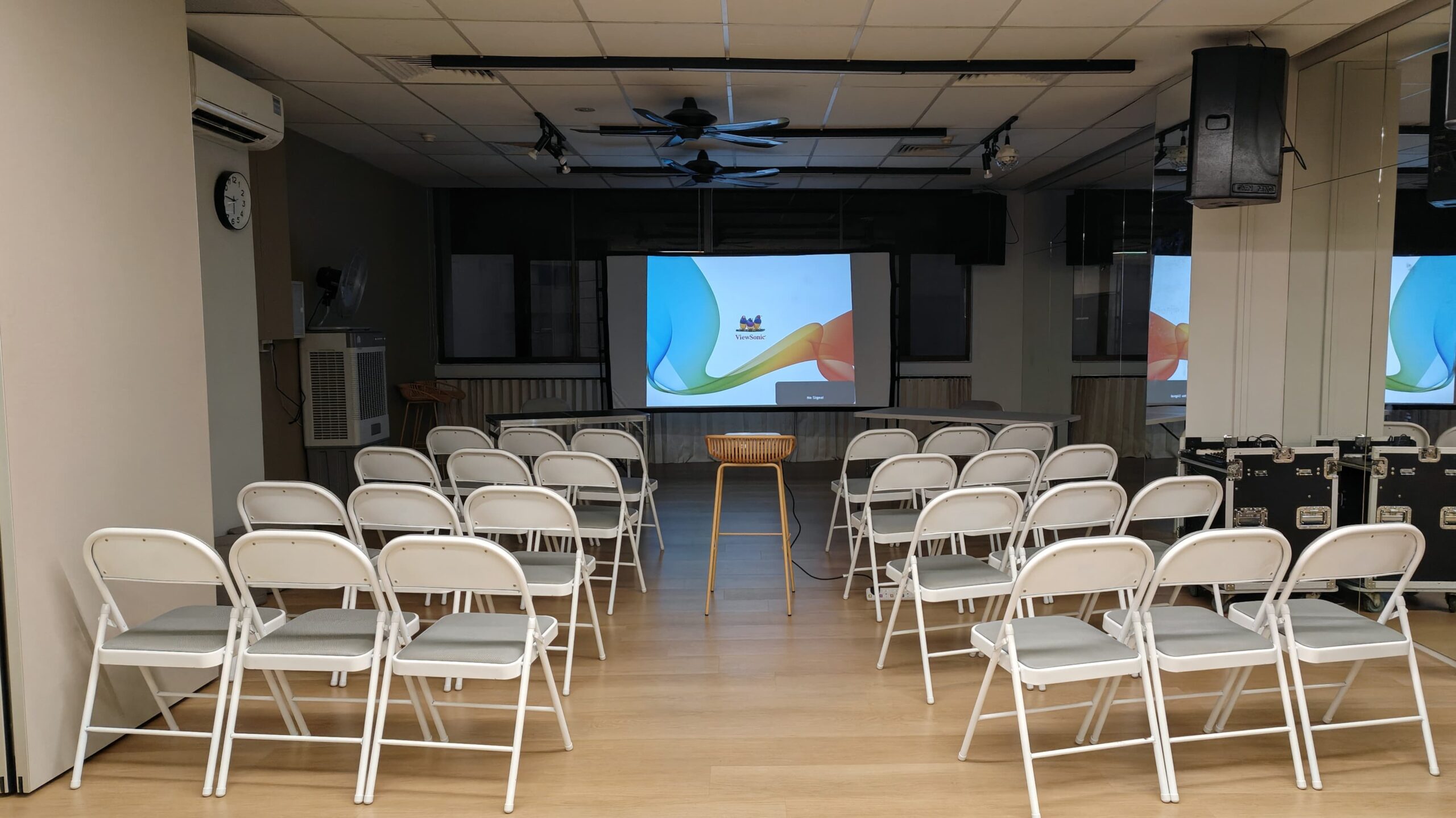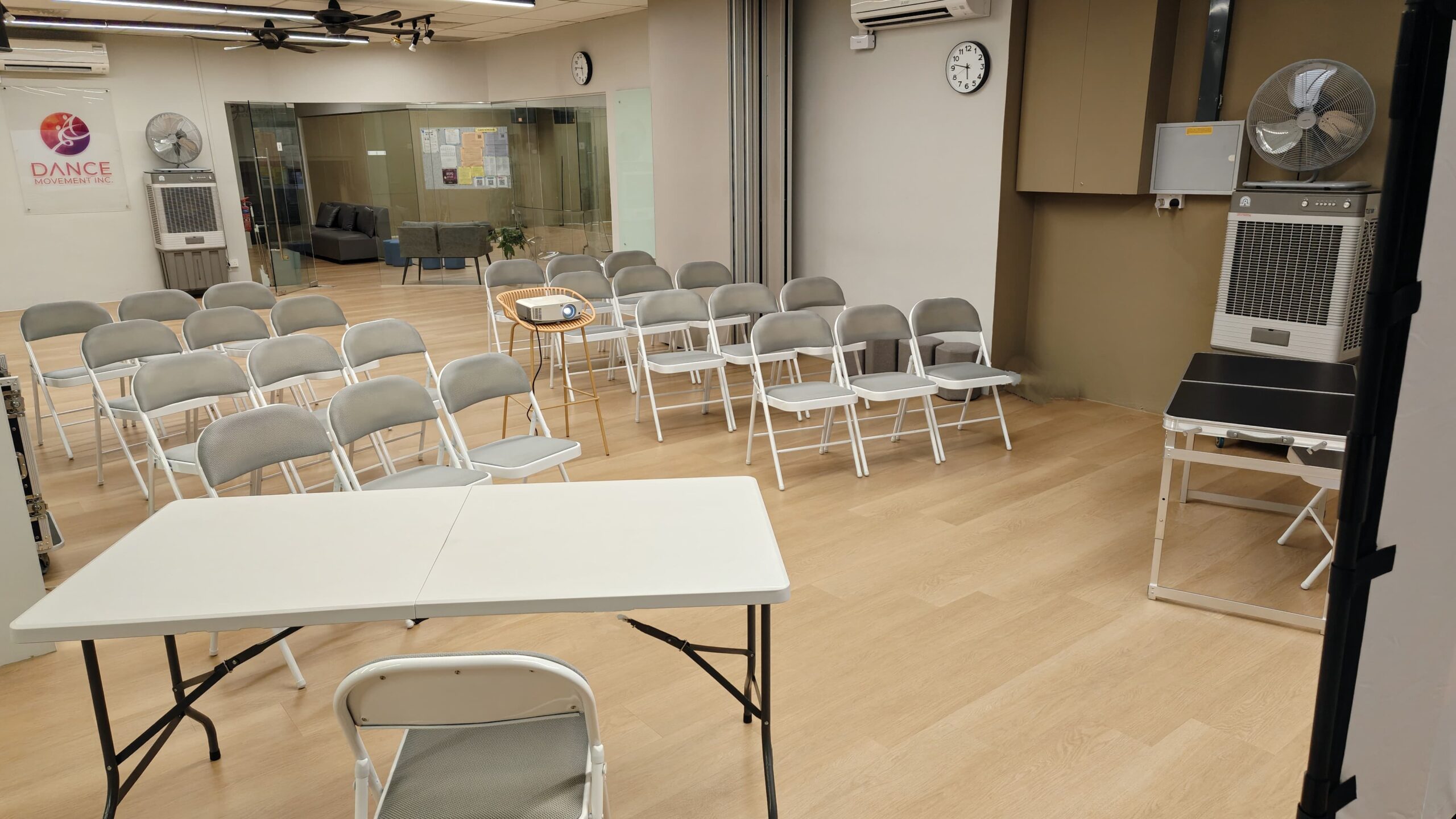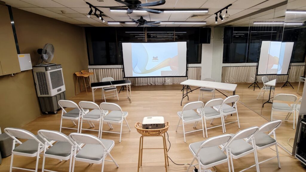 Well-equiped : All of our spaces are fully air-conditioned, equipped with full-length mirrors, its own sound systems and lighting controls. We also have chairs, tables, projector and projector screen available for rent.